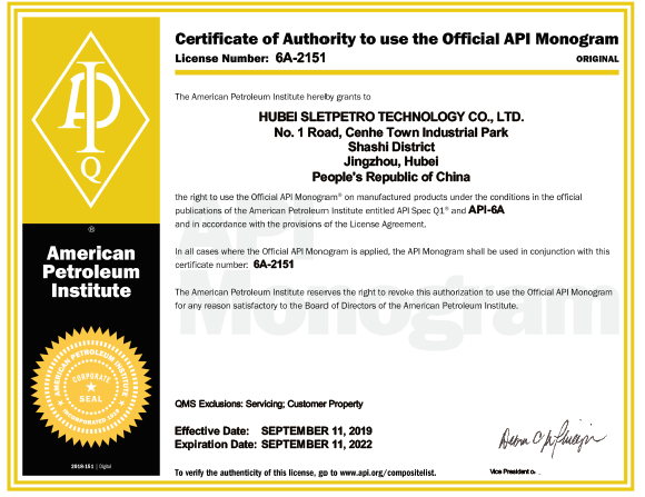 Качество всегда является принципом SLETPETRO. В выборе сырья мы поддерживаем тесное сотрудничество с Timken и Daye Steels. Ключевые процессы кования всегда производится в нашем самом передовом цеху. Наши сотрудники по контролю качества ежегодно принимают обучение на базе SGS, чтобы получить более глубокие знания в области контроля технологических процессов. Наша продукция высокого давления прошла аудит API, и получила сертификаты API 6A и API 16C, наш производственный процесс, контроль качества и функциональное соответствие полностью признаны.